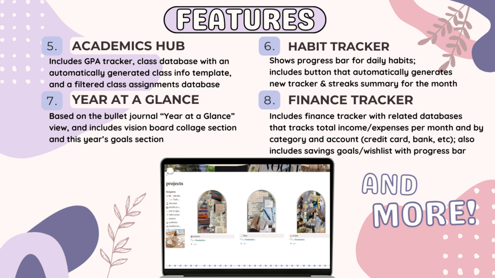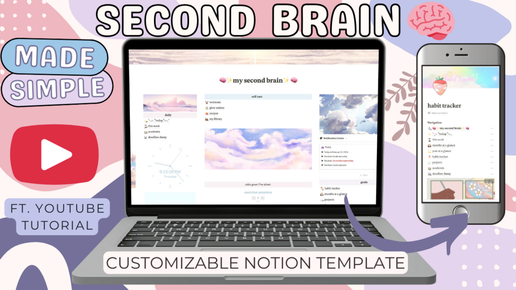 Imagine having the perfect life planner... in digital format. Meaning, you can access it whenever and wherever you are, even on your phone or tablet! Better yet, it'll be with you FOR LIFE, meaning there's no chance of losing this planner, or running out of pages, or spilling your coffee all over it (been there, done that)! The "Second Brain Made Simple" makes getting things done simpler, easier, and faster, and its user-friendly features help even the Notion newbie tackle their to-do list. With frameworks based on viral (and procrastination-proof ) planning methods like the 12 Week Year, aesthetic designs to keep you motivated to work hard and stay focused, and a full YouTube video tour with explanations (found on YouTube channel "Study To Success"), the "Second Brain Made Simple" is the ultimate tool to have by your side to finally conquer your goals and that never ending to-do list!