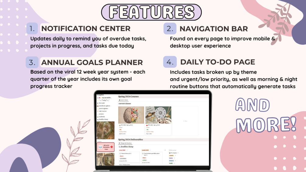Imagine having the perfect life planner... in digital format. Meaning, you can access it whenever and wherever you are, even on your phone or tablet! Better yet, it'll be with you FOR LIFE, meaning there's no chance of losing this planner, or running out of pages, or spilling your coffee all over it (been there, done that)! The "Second Brain Made Simple" makes getting things done simpler, easier, and faster, and its user-friendly features help even the Notion newbie tackle their to-do list. With frameworks based on viral (and procrastination-proof ) planning methods like the 12 Week Year, aesthetic designs to keep you motivated to work hard and stay focused, and a full YouTube video tour with explanations (found on YouTube channel "Study To Success"), the "Second Brain Made Simple" is the ultimate tool to have by your side to finally conquer your goals and that never ending to-do list!
